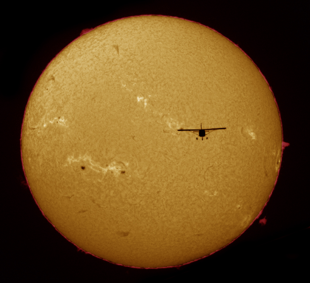 La riposta è quella di puntare con l’aeroplano (non abbastanza a lungo da colpirlo, ovviamente…!!!) l’osservatore al suolo e contemporaneamente il punto antisolare. Per materializzarlo “basta” montare un retroriflettore nei paraggi dell’osservatore di dimensioni abbastanza importanti da convogliare abbastanza luce solare da essere facilmente visibile di giorno ad occhio nudo da una distanza di una decina di kilometri. Presto fatto costruiamo un retroriflettore con tre specchi “casalinghi” da 60cm di lato che posizioniamo a fianco dell’aviosuperficie dell’AeroClub di Rovigo. Marco, che osserva il sole da quando ci siamo conosciuti alle scuole superiori, si piazza a poca distanza con il suo telescopio ed io, ai comandi di un piccolo aereo biposto, mi presto allo scatto. Il breve periodo di tempo a disposizione e la necessità di un cielo terso e sgombro di nubi osservando il Sole a un’altezza di meno di una decina di gradi farà si che inseguiamo questo obiettivo per quasi un anno, ovviamente contando i ritagli di tempo dal lavoro ed altri impegni. Finalmente il 20 agosto tanta costanza viene premiata ed otteniamo alcune sequenze da cui sono tratti gli scatti che riportiamo in queste pagine.