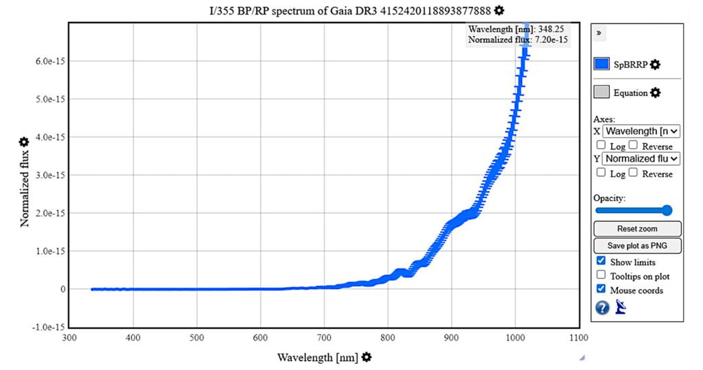 In ultimo, per compensare con lo spettro mancante, esso è stato estratto dal database GAIA DR3. Nel grafico (fig. 8) si nota con facilità il forte sbilanciamento della radiazione emessa dalla sorgente verso gli infrarossi mentre, nella regione visibile il flusso misurato è praticamente 0. Con uno spettro nel solo dominio ottico, prima dell’accensione della sorgente in OIII, sarebbe risultato quasi impossibile confermarne la natura di nebulosa planetaria.