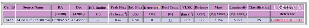 In un ulteriore catalogo, ATLASGAL (APEX Telescope Large Area Survey of the Galaxy, una grande survey millimetrica della Via Lattea, realizzata con il telescopio APEX) sono state poi estratte informazioni importanti relative alla distanza (quasi 14kpc), massa, luminosità e classificazione, classificando l’oggetto misterioso come una potenziale PN (nebulosa planetaria).