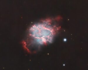 Durante l’elaborazione dei dati, il Team ha notato la presenza di un oggetto nel campo ripreso dal T5 (un RH200mm f//2) durante la sessione su GUM14/15. Un oggetto molto piccolo ma tuttavia decisamente evidente nella periferia del campo inquadrato con la forma tipica di una nebulosa planetaria, dagli accesi colori rossi e verdi. Abbiamo subito cercato nei cataloghi amatoriali tracce di questo oggetto ma, non trovando assolutamente niente, siamo passati agli archivi degli scatti ma anche qui con poco successo, se non nelle riprese a largo campo fatte su GUM14.