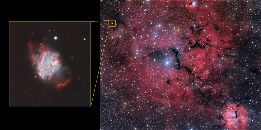 Abbiamo acquisito le immagini delle due nebulose attraverso il telescopio T5 del servizio Chilescope, investendo parte del budget raccolto, come sempre, in modalità “open” (ognuno partecipa con quanti soldi desidera).