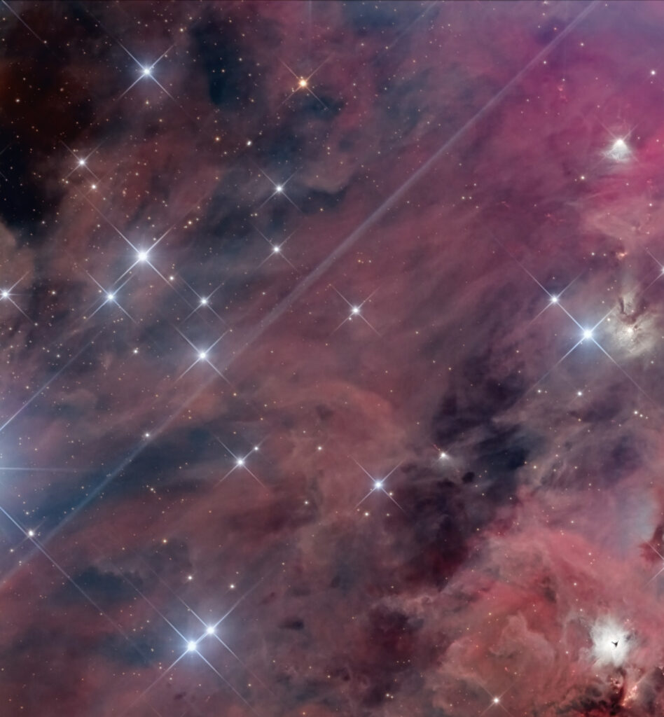 Orione è un concentrato impressionante di soggetti: nubi di idrogeno ionizzato, zone polverose, nebulose a riflessione e oscure che rendono questa zona di cielo un’esplosione di colori.