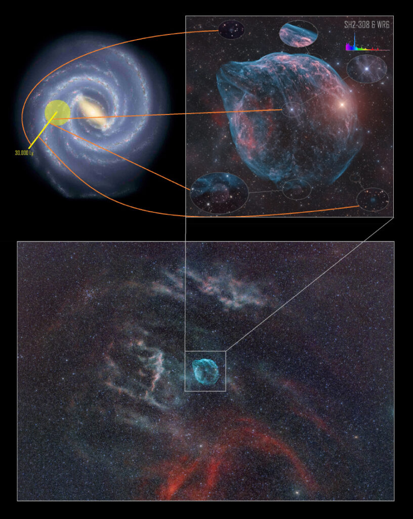 Ampliando lo sguardo e allontanandoci dal guscio principale, ovvero la Testa del Delfino, è possibile osservare inoltre altre nebulosità più estese, concentriche e centrate sempre su WR6. I due principali “complessi” di questa struttura sono classificati come SH2-303, SH2-304 e sembrano appunto strette parenti di SH2-308 e WR6.