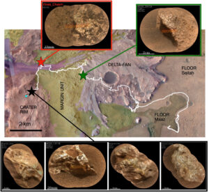 L’ulteriore scoperta a seguire di rocce simili incastonate all’interno del substrato roccioso, cioè saldamente integrate nella roccia madre e non semplicemente appoggiate sopra come frammenti trasportati, potrebbe indicare che le sferule siano effettivamente parte della formazione geologica del sito stesso e non elementi estranei finiti lì in un secondo momento. Una prova che rafforzerebbe la prima ipotesi e che quindi le sferule si siano formate durante l’impatto che ha creato il cratere Jezero, coerentemente con la storia geologica della regione tratteggiata fino a questo momento, e senza richiedere per la loro genesi la presenza di acqua.
