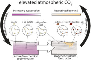 Ma la storia non finisce qui: i ricercatori hanno anche identificato minerali come ematite, goethite e akaganeite che sono derivati dalla diagenesi della siderite (cioè l’insieme dei processi che trasformano i sedimenti in rocce compatte successivamente alla loro deposizione) in condizioni ossidanti. Ciò indica che una parte del carbonio, inizialmente intrappolata nei carbonati, fu successivamente rilasciata nell’atmosfera marziana chiudendo così un ciclo del carbonio parzialmente simile a quello terrestre.