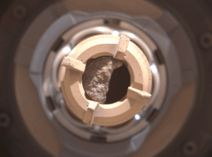Tre giorni dopo, nel Sol 1444, viene tentato un nuovo prelievo sempre su Broom Point. Qui le cronache si fanno nebbiose perché l’operazione non è stata documentata nei canali di comunicazione della NASA e ci dobbiamo basare sulle immagini grezze messe a disposizione. Il campione roccioso viene prelevato dal basamento ma risulta parzialmente bloccato nel meccanismo di estrazione integrato nella punta del trapano. Dopo la foto della MastCam-Z, (vedi immagine), si perdono le tracce del campione: le foto successive mostrano la punta nuovamente sgombra di materiale e anche le immagini di CacheCam, la camera che documentata lo stato delle fiale prima della loro chiusura, mostrano un contenitore totalmente vuoto. Possiamo ipotizzare che, visto il parziale insuccesso del prelievo, i tecnici abbiano accettato di scartare il campione lasciandolo al suolo. Tuttavia non siamo in grado di confermare l’ipotesi perché all’indomani delle operazioni il rover viene fatto spostare rendendo così impossibile cercare nelle immagini dei dintorni di Perseverance l’eventuale residuo del prelievo. Fortunatamente Marte si è dimostrato pronto a farci dimenticare in fretta questa possibile disavventura presentandoci una nuova straordinaria roccia.
