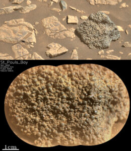 Durante la sequenza di attività svolte in prossimità di Broom Point un’ulteriore roccia ha attirato le attenzioni degli scienziati NASA la cui superficie risulta costellata di minuscole sferette grigie grandi non più di pochi millimetri. Molte delle bolle sono perfettamente sferiche, altre sono schiacciate o spezzate a metà. Nel Sol 1442 Perseverance ha osservato i dettagli della curiosa roccia, denominata St. Pauls Bay, con le camere zoom MastCam e con il telescopio SuperCam RMI.