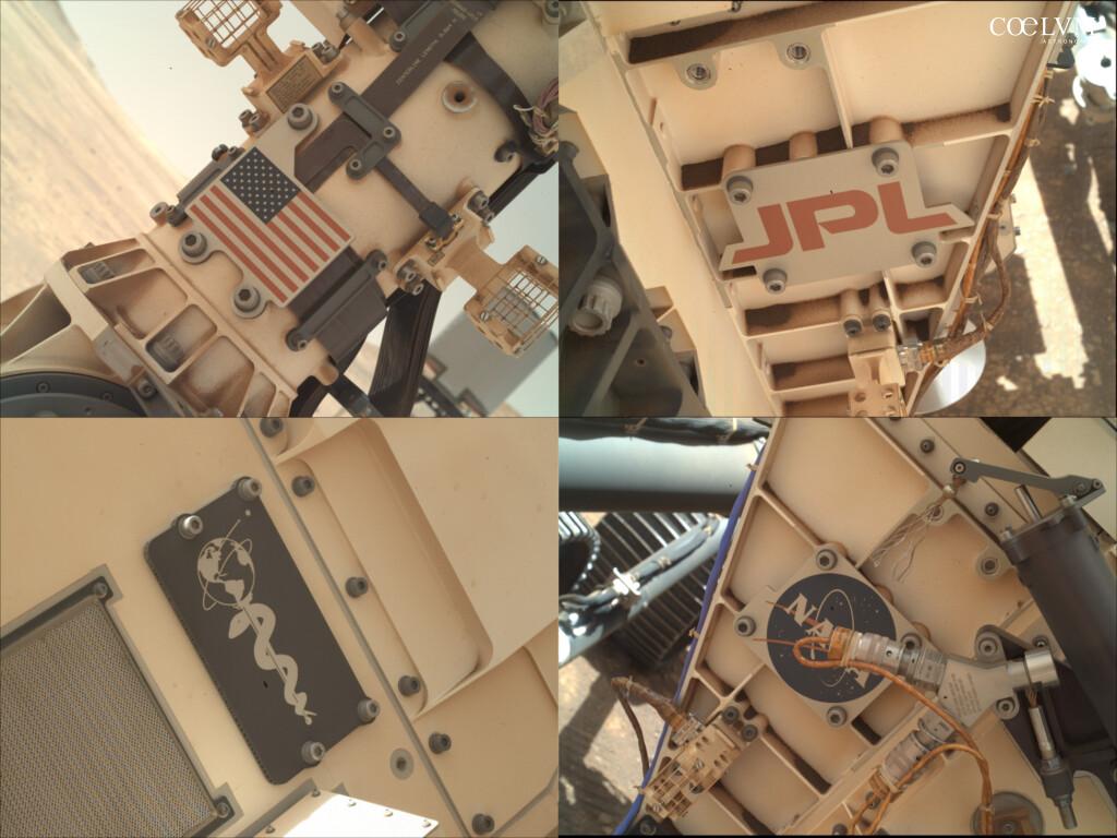 Il 4 luglio, ricorrenza dell’Independence Day americano, innesca una breve pausa nelle attività su Marte. Qualche giorno prima il rover aveva fotografato alcune delle targhe affisse sulla propria struttura esterna, inquadrate per mezzo della camera WATSON montata sul braccio robotico. Le targhe immortalate sono quelle con il logo del Jet Propulsion Laboratory, il logo della NASA e anche una targa speciale dedicata a medici e infermieri che nell’estate nel 2020, periodo del lancio della missione Mars 2020, si trovavano a fronteggiare in prima linea il periodo più duro dell’emergenza mondiale legata a COVID-19. Sul fondo nero della targa troviamo il bastone di Asclepio sormontato dal globo terrestre. Una scia sottile orbita la Terra vicino all’equatore: si tratta della traiettoria stilizzata della capsula contenente Perseverance e Ingenuity che decolla da Cape Canaveral e giunge su Marte.