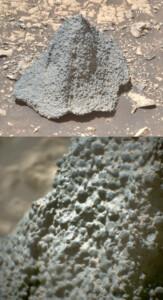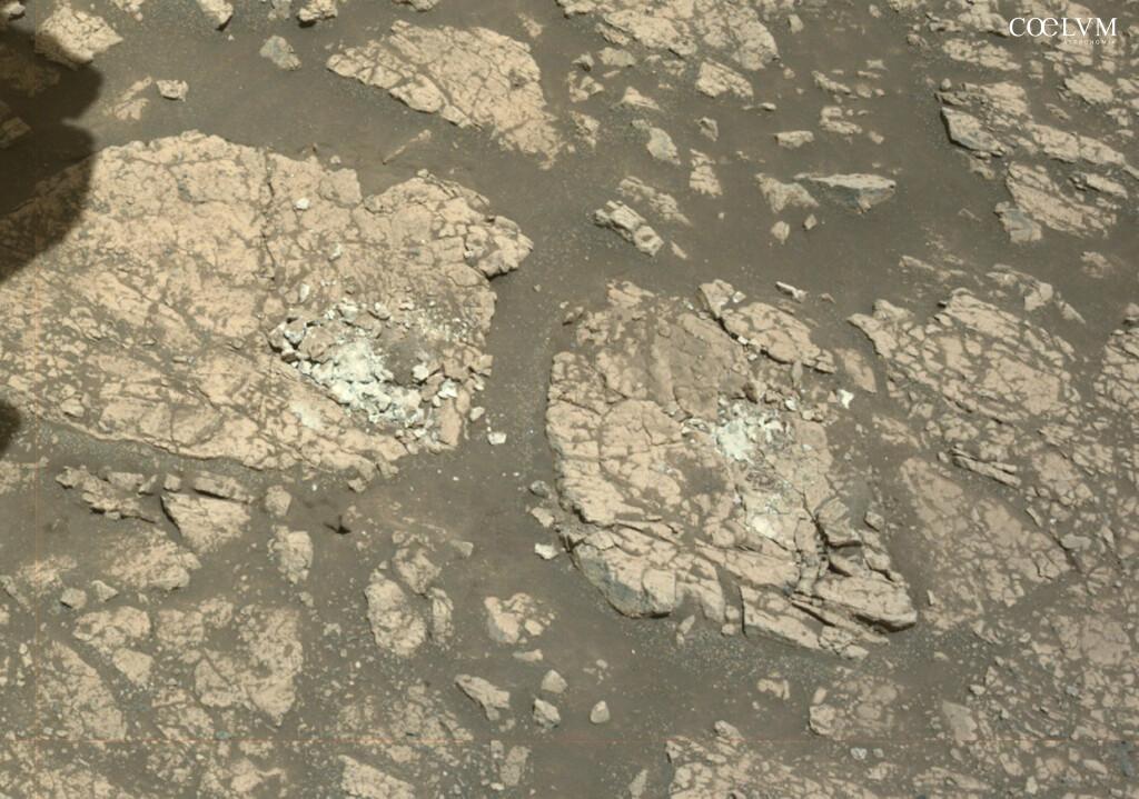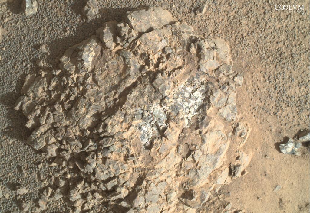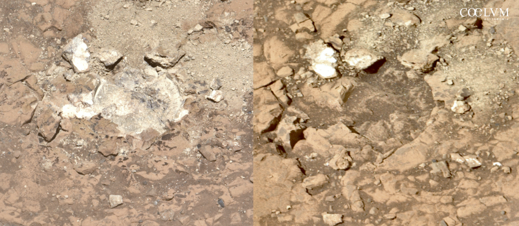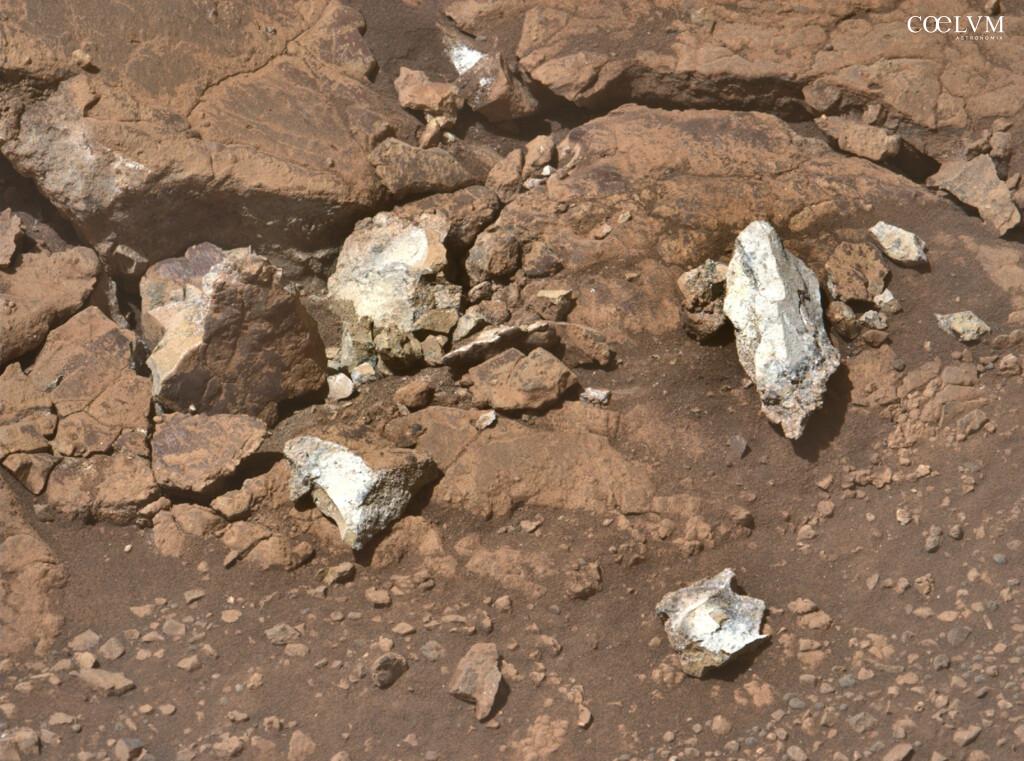 In un mondo extraterrestre dominato da tonalità grigie e scure, queste rocce appaiono sorprendentemente biancastre quasi un’anomalia, dato che, sulla superficie di Marte, le rocce chiare sono rare e, nel caso presenti, indicano spesso processi geologici legati alla presenza di acqua.
