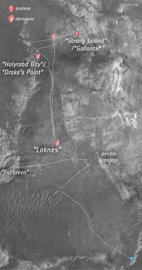 Al termine delle foto e delle analisi chimiche in questa località, il robot NASA è tornato verso est per indagare i basamenti scuri di Krokodillen, confermare la presenza delle argille e prelevarne almeno un campione.