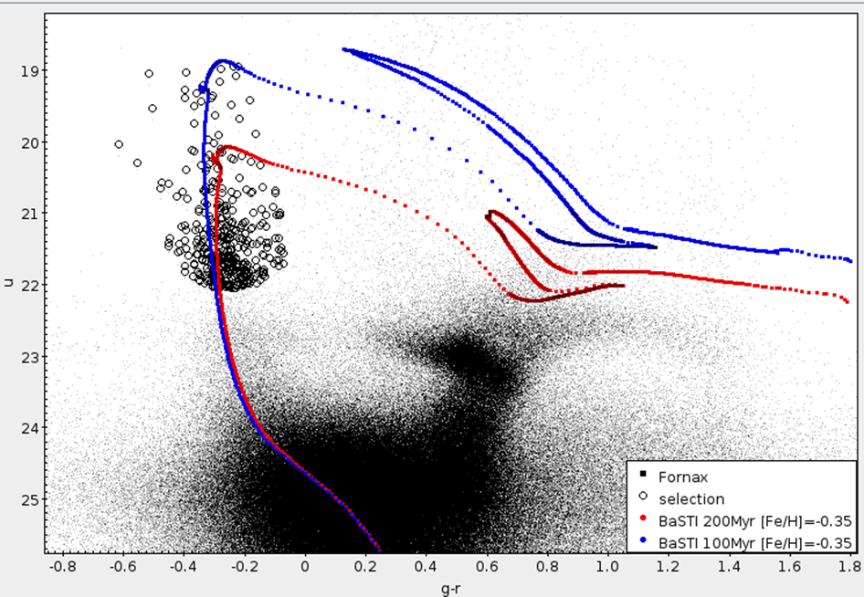 Recentemente, il nostro gruppo ha analizzato osservazioni di Fornax dSph, ottenute attraverso il telescopio VST nell’ambito della surveyKiDS (Kilo-DegreeSurvey), un programma di ricerca in realtà focalizzato allo studio delle galassie ad alto-redshift, ma la cui “finestra di osservazione” ha intersecato la parte nord di Fornax dSph. I dati erano di qualità eccellente, e ci hanno consentito di operare un’analisi delle sue popolazioni stellari, utilizzando per la prima volta la banda fotometrica u, che copre una regione dello spettro nel vicino ultra-violetto. Questa banda è particolarmente adatta per studiare le sorgenti calde, che osservate in essa risultano più brillanti che nelle altre. Proprio l’uso della banda u, con nostra enorme sorpresa, ha evidenziato uno sparuto gruppo di stelline, che nel diagramma colore-magnitudine1 (figura 2) sono compatibili con una popolazione stellare giovanissima, addirittura di 100 milioni di anni. Abbiamo quindi pensato di vederci più chiaro, ed abbiamo chiesto ed ottenuto nuove osservazioni di Fornax dSph con il VST, per coprire la parte esclusa dalla finestra di KiDS.