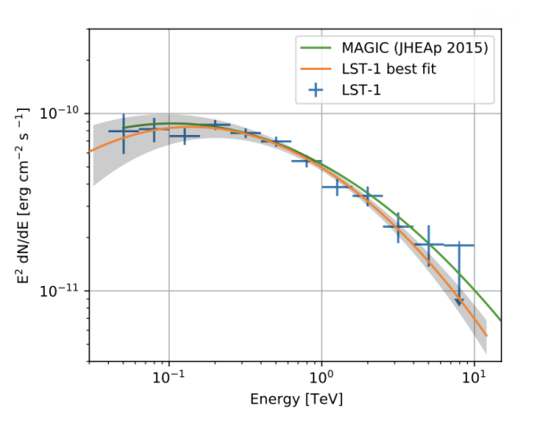 In figura si mostra una SED della Nebulosa del Granchio, la fonte di raggi gamma per eccellenza. Dal grafico possiamo dedurre informazioni come la potenza e la forma dell’emissione (che ci permette classificare la sorgente), ma anche che tipi di meccanismi di accelerazione di particelle avvengono in questa zona dell’universo. Inoltre, rappresenta un oggetto fondamentale per la calibrazione di LST-1 in quanto non presenta particolari variazioni a livello di luminosità ed è ben osservata da parecchi telescopi.