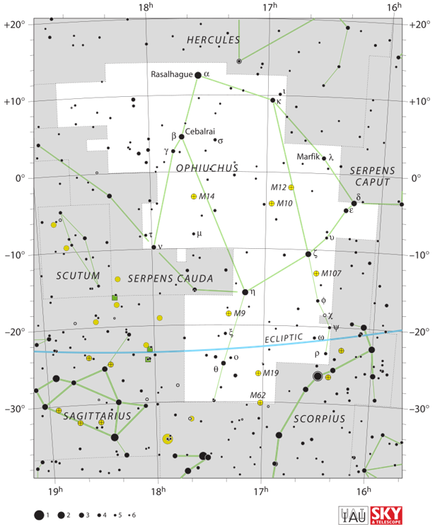 Al contrario di Messier 18, M19 è facilmente rintracciabile. Il modo piú semplice per individuarlo nel cielo notturno è partire dalla stella piú luminosa dello Scorpione, Antares (αScorpii) e tracciare una linea immaginaria verso Theta (θ) Ophiuchi. L’ammasso si troverà a circa metà di questo percorso.