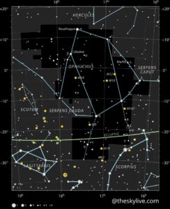 Un modo per rintracciare l’ammasso è partire da M10 e muoversi per circa 3 gradi (più o meno la distanza coperta dal diametro apparente di sei lune piene) verso nord-est.