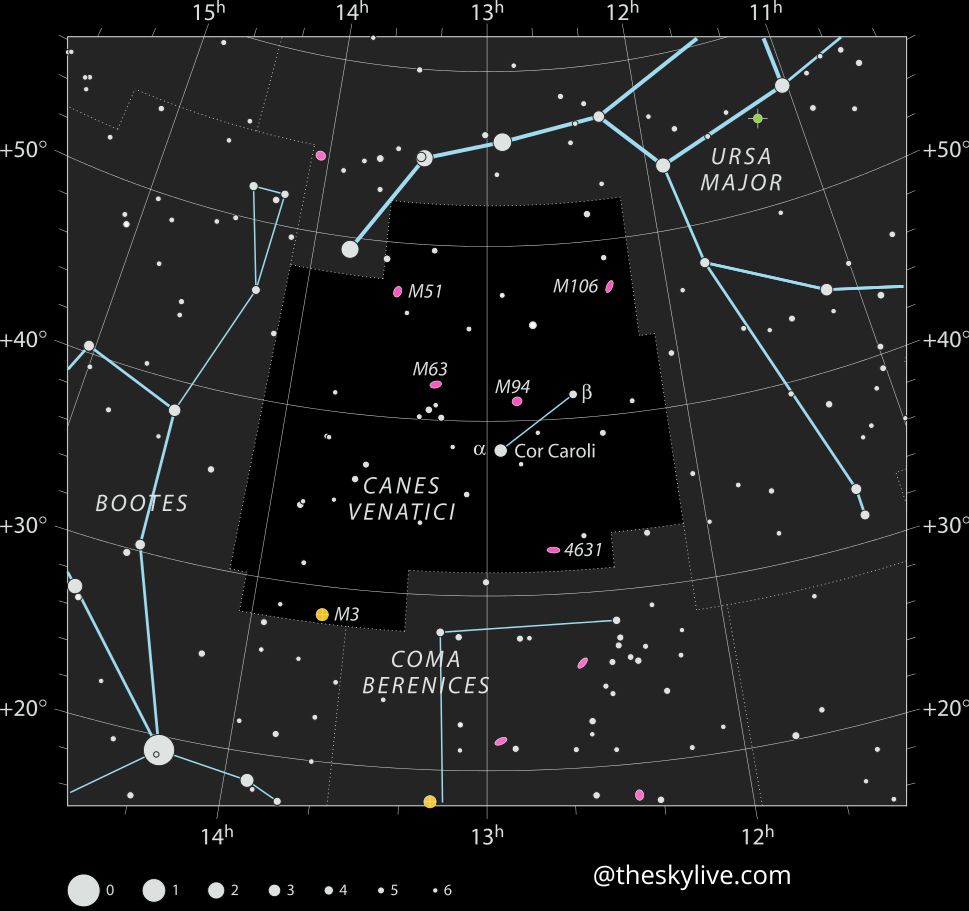 M3 si può rintracciare nella costellazione dei Canes Venatici, al confine tra il Bootes e la Coma Berenices, in una zona relativamente sgombra da stelle luminose. La più vicina è infatti Beta Coma Berenices, di quarta magnitudine, situata a circa 7° ad ovest dall’ammasso stesso.