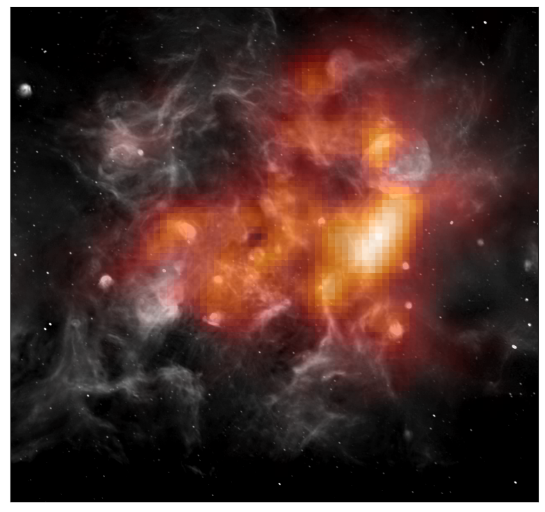 Fig. 3 – Regione di formazione stellare Cygnus-X. L’emissione di raggi gamma osservata dal satellite Fermi-LAT alle energie di qualche GeV è mostrata in arancione, in scale di grigio invece è mostrata l’emissione radio alla lunghezza d’onda di 21cm. Il cluster Cygnus OB2 (non visibile nell’immagine) sarebbe posizionato nel centro. Crediti immagine: Stefano Menchiari.