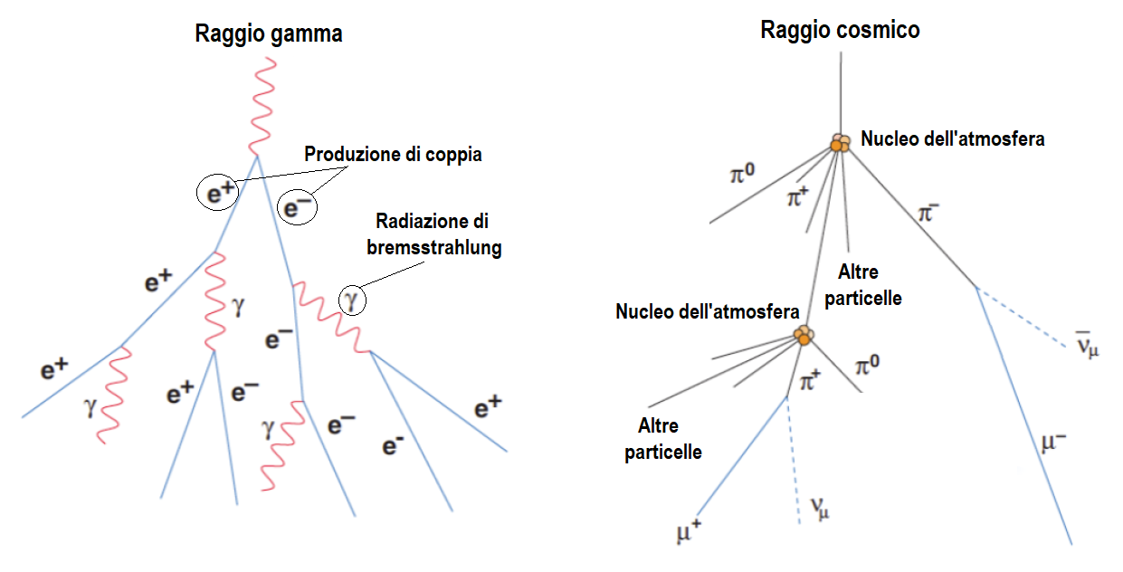 Fig. 4 – Esempio schematico di cascata elettromagnetica (sinistra) ed adronica (destra). Le particelle cariche della cascata come elettroni (e-), positroni (e+), muoni (μ士), e pioni (π士) sono più veloci della luce nell’aria e producono la radiazione Cherenkov osservata dagli IACT. Crediti immagine: Alessandro Montanari, Imaging Atmospheric Cherenkov Telescopes Technique, DOI: 10.13140/RG.2.2.34140.95361/1.