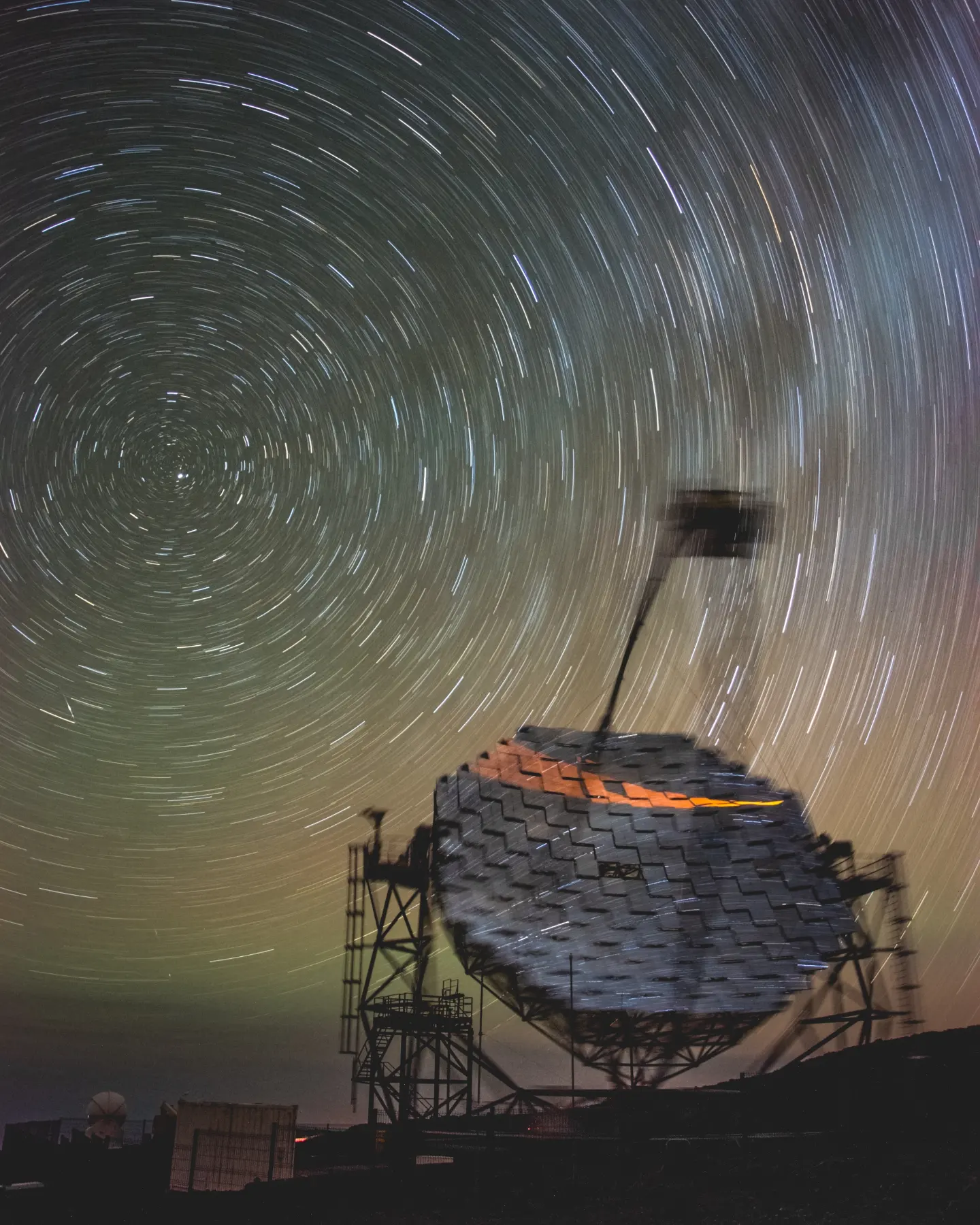 Fig. 5 – Il telescopio Cherenkov MAGIC durante una sessione di presa dati. MAGIC è un array composto da soli due telescopi IACT, ed è localizzato all’osservatorio Roque de los Muchachos in La Palma (Spagna). Crediti immagine: Stefano Menchiari.