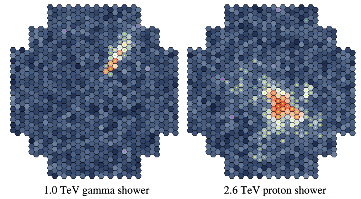 Il riconoscimento del tipo di cascata viene effettuato da specifici algoritmi di machine learning, che vengono “addestrati” per riconoscere le differenze tra cascate adroniche ed elettromagnetiche analizzando milioni di esempi di eventi simulati. Questi algoritmi sono in grado di classificare ogni nuova immagine assegnando una probabilità di essere stata generata da un raggio gamma anziché da un raggio cosmico. Sfruttando i passi da gigante compiuti negli ultimi anni nel campo dell’intelligenza artificiale, lo sviluppo di algoritmi per la ricostruzione e discriminazione delle cascate è al momento una degli obiettivi cardine portati avanti dagli astronomi gamma.