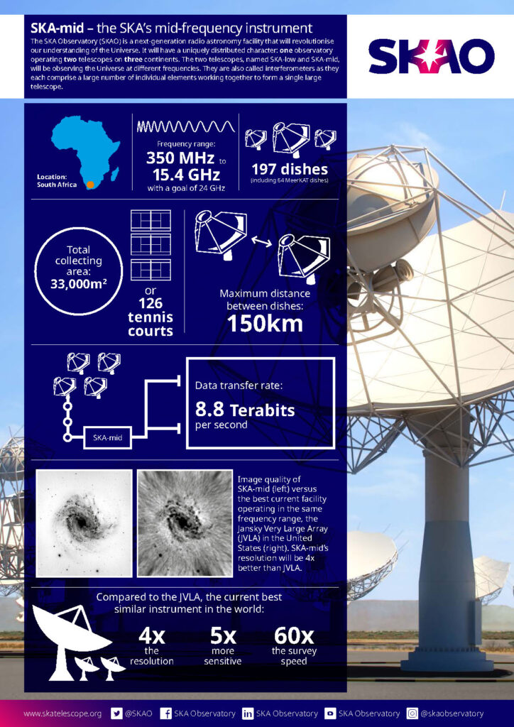 Le parabole di grandi dimensioni di SKA-Mid saranno situate in una regione del Sud Africa chiamata Karoo e poste a varie distanze tra di loro. La distanza maggiore tra due parabole, quella che tecnicamente viene definita la “linea di base” del sistema, è attualmente di circa 150 km, ma si pensa in futuro di poterla estendere costruendo parabole più remote nei paesi vicini, tra cui Botswana, Ghana, Kenya, Madagascar, Mauritius, Mozambico, Namibia e Zambia. Aumentando la linea di base, infatti, si aumenterà il potere risolutivo di SKA-Mid, un fattore cruciale per poter osservare i dettagli più fini negli oggetti cosmici radio emittenti. Il radiotelescopio MeerKAT, esistente e perfettamente funzionante, farà parte dell’array: le sue parabole da 13,5 metri di diametro si uniranno alle parabole SKA (leggermente più grandi, da 15 metri di diametro), tutte integrate in un unico sistema.