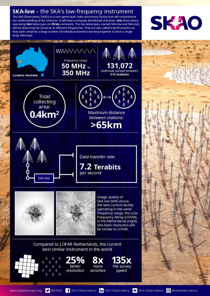 Le 131.072 piccole antenne operanti a bassa frequenza del progetto SKA-Low sono invece posizionate in Australia Occidentale. Si tratta di una “foresta d’acciaio” di strutture metalliche alte due metri (6,6 piedi), simili ad alberi di Natale, divise in 512 stazioni di 256 antenne ciascuna, situate a InyarrimanhaIlgari Bundara, nella terra degli indigeni Wajarri Yamaji.
