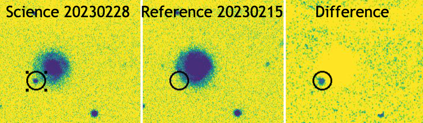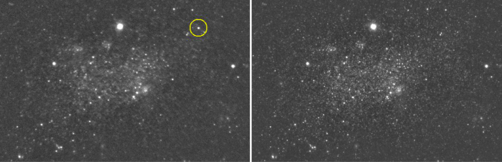 La metodologia utilizzata per il progetto SEEING prevede una prima fase di raccolta e immediata riduzione delle immagini, effettuata grazie a codici e algoritmi avanzati sviluppati dal gruppo Transient Neapolitan Team (TNT) dell’Osservatorio di Capodimonte. Successivamente, i candidati alle esplosioni di novae vengono individuati tramite tecniche sofisticate di difference imaging, progettate per rilevare transienti nascosti nel fondo luminoso delle galassie. Un esempio significativo è rappresentato dallo studio dell’evoluzione fotometrica e spettroscopica della nova AT2024aawe, scoperta nella galassia irregolare Sestante B (Figura 2). Questa galassia, con una massa pari a circa 1/50 di quella della Grande Nube di Magellano, presenta un tasso di esplosioni di novae stimato a una ogni vent’anni, contro i 2,5 eventi annuali della Grande Nube di Magellano. Questo rende l’osservazione della nova AT2024aawe particolarmente preziosa. Il vasto campo visivo del VST consente inoltre di identificare transienti astrofisici in galassie più lontane, come le supernovae. In Figura 3 sono presentati due esempi di supernovae scoperte nel campo visivo attorno alla galassia Sestante B.