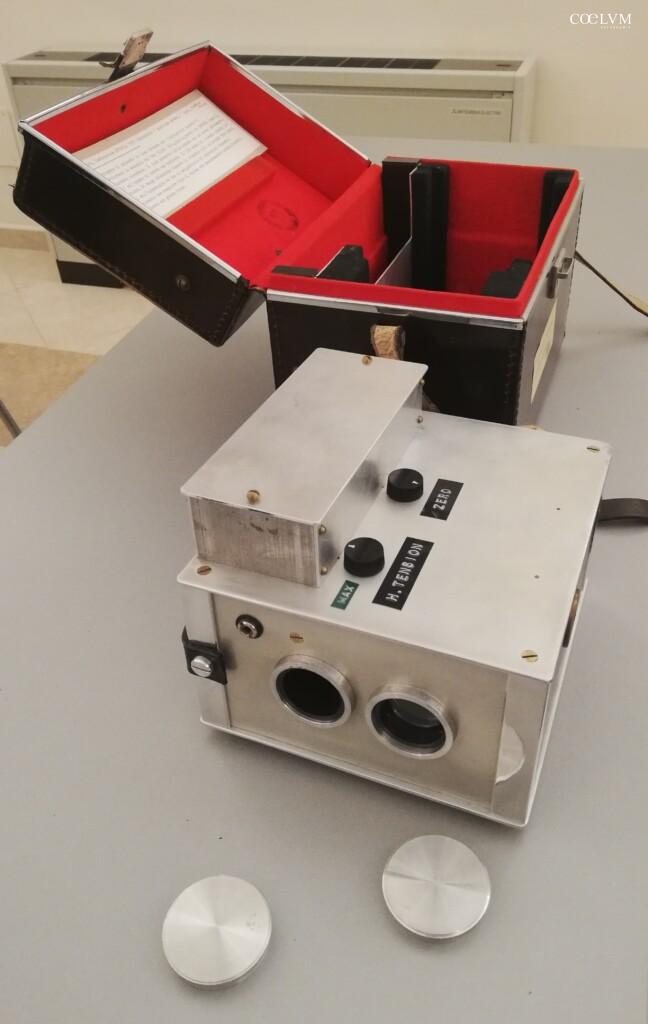 Il fotometro del 1976 era un’unità completa, fornita con un paraluce in gomma, un jack per collegare strumenti di misurazione esterni, batterie e una chiave per i collegamenti. Una borsa rigida appositamente progettata garantiva un trasporto sicuro, come mostrato in una delle figure originali (fig. 4). Al suo interno, la parte elettronica di controllo era visibile, con i componenti organizzati per facilitare la gestione dello strumento.