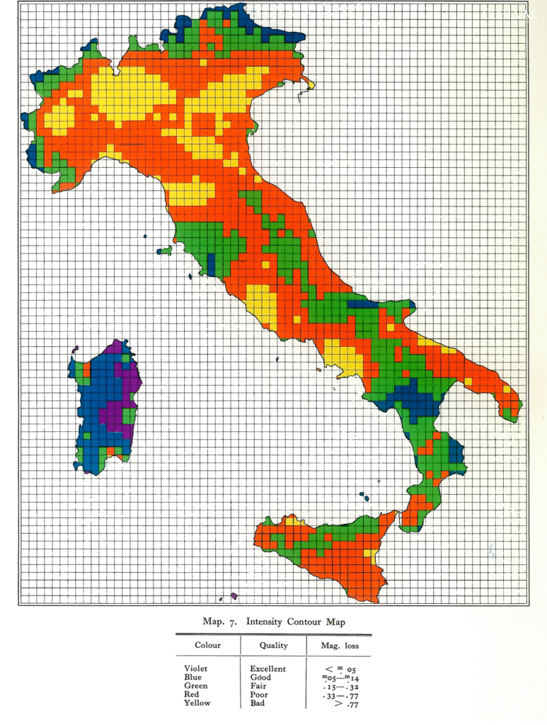 La pubblicazione del 1973 quantificò anche l’impatto dell’inquinamento luminoso sulla magnitudine limite, ovvero la stella più debole che può essere osservata da un dato sito, e associò i colori utilizzati nelle mappe a diverse classi di qualità del cielo. Queste informazioni, visualizzate nelle Figure 6 e 7, mostrano il danno concreto apportato alla capacità osservativa e hanno permesso di identificare le regioni più adatte per l’installazione di nuovi osservatori, come la Sardegna e alcune aree del Sud Italia, dove la perdita di magnitudine limite era inferiore a 0.1, indicando cieli ancora molto bui. Al contrario, in gran parte dell’Italia settentrionale e in Sicilia, la perdita superava 0.1, con valori significativamente più alti nei pressi delle grandi città. Questo sistema di classificazione visiva ha reso le mappe facilmente interpretabili e ha fornito un riferimento immediato per la valutazione della qualità del cielo.