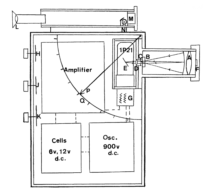 - Elettronica: L’unità, alimentata da due batterie da 6V, includeva gli alimentatori, un amplificatore e un convertitore per fornire l’alta tensione al fotomoltiplicatore. Un microamperometro montato al contrario misurava il segnale in uscita.