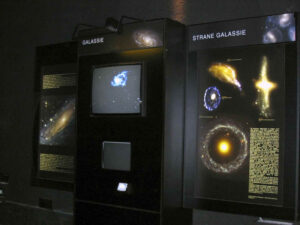 Scorrono su uno spettacolare geode-video dipinti e sculture ispirate al cielo e vari soggetti astronomici per finire con le splendide riprese di Hubble, il nostro ultimo “occhio nello spazio”. Presso il pannello dedicato ai buchi neri si lasciano le sale espositive e dalle lontane regioni dell’universo, tramite un corridoio con immagini del cielo profondo, possiamo tornare direttamente al punto di inizio della nostra visita.