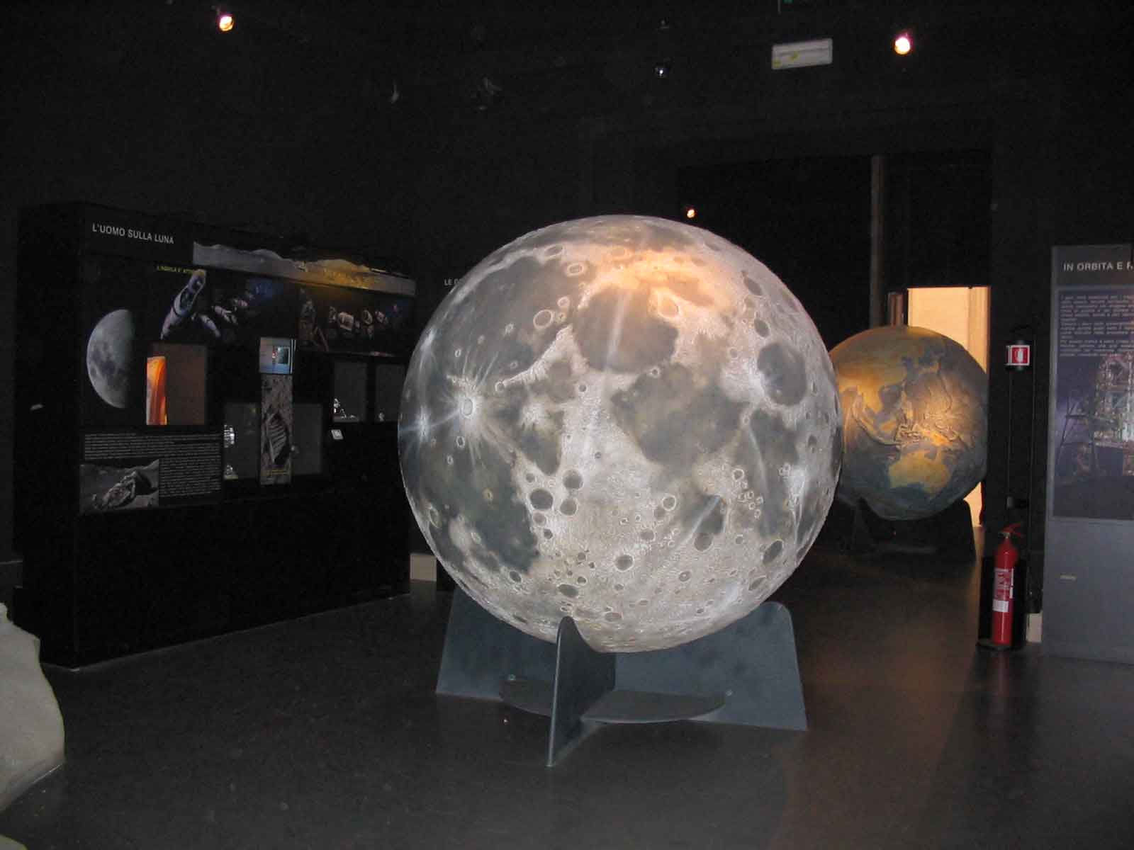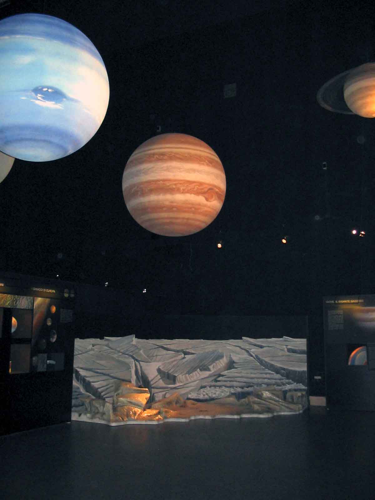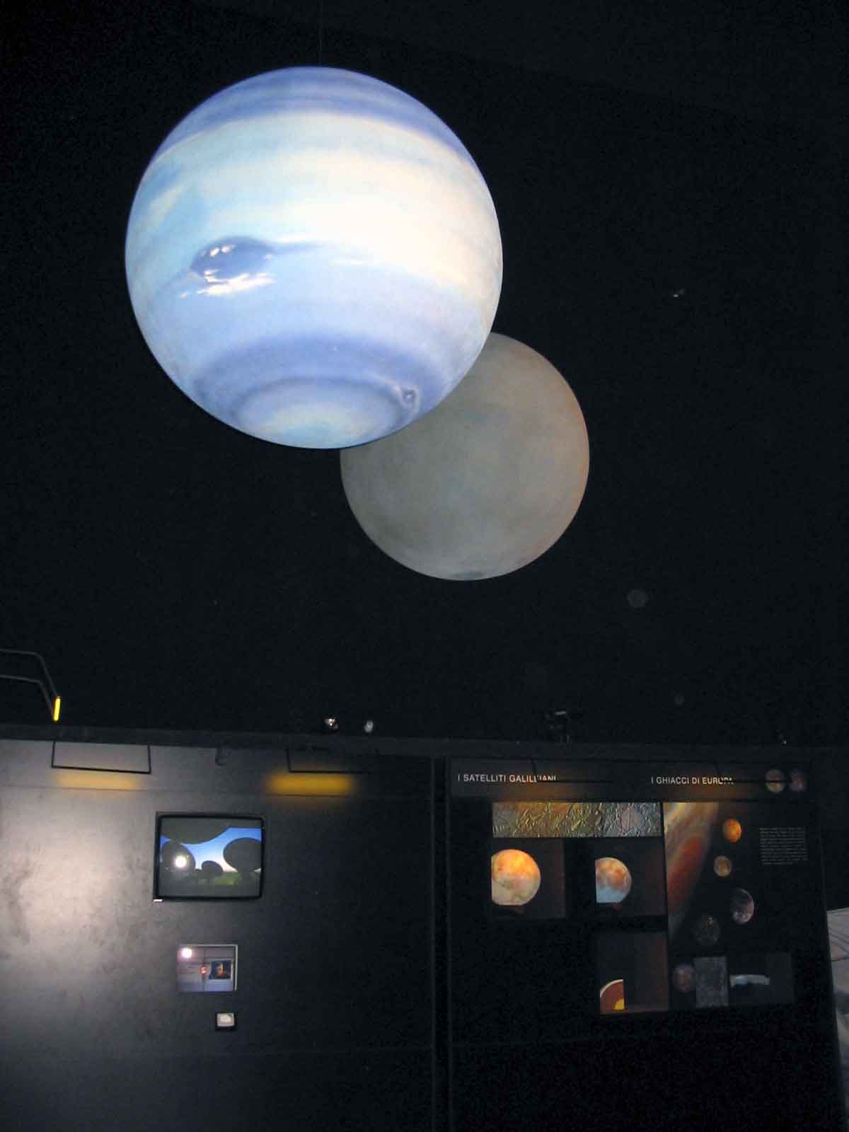 Il percorso museale è molto curato scenograficamente, le sale vogliono dare l’idea del buio dello spazio. Ci sono bei modelli dei pianeti sospesi in questi alti spazi neri, “ mi piacerebbe pure che in questi ambienti ci fosse il gelo dello spazio” dice sorridendo Vomero, con al disotto di essi pannelli con brevi testi esplicativi sulla loro geologia, l’esplorazione, ma anche curiosità. Evidentemente non c’è la pretesa di spiegare tutto, ma di dare degli stimoli affinché il pubblico continui ad informarsi e magari senta il bisogno di approfondire. Alle sale dedicate alla Terra ed alla Luna seguono, senza trascurare i vari vettori usati dall’Uomo per esplorare lo spazio, quelle sui pianeti rocciosi ed i pianeti gassosi. Non mancano postazioni interattive e due diorami evocativi della superficie della Luna e di Europa, con una sezione dedicata alla ricerca di vita sul lontano satellite gioviano.