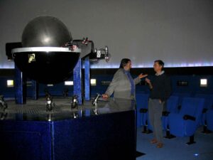 Alla consolle di gestione del planetario incontriamo Stefano Giovanardi, uno dei giovani curatori scientifici, a lui chiediamo: Quali ritieni siano i punti di forza di questo planetario? Quale è la filosofia con cui lavorate?
