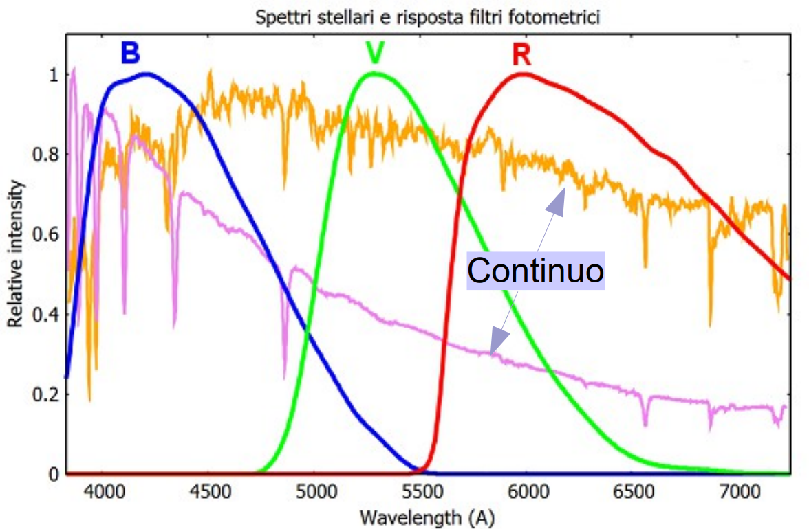 Figura 11: Spettri di stelle di tipo A0V (Vega, profilo fucsia) e G2V (Sole, profilo arancio) confrontati con le curve di risposta dei filtri fotometrici (B, V, R).