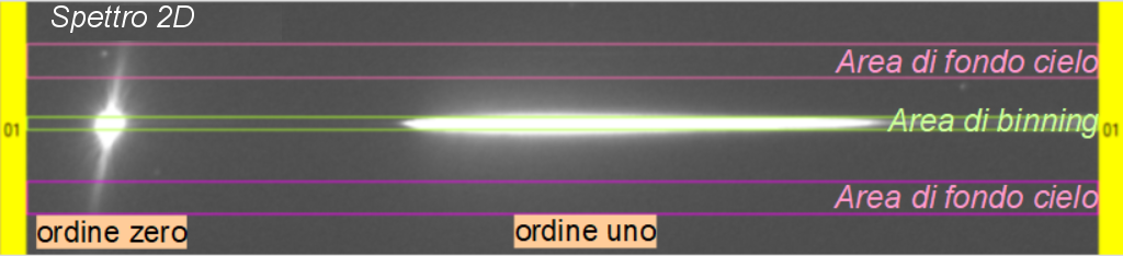 Il primo passo sarà quello di estrarre il profilo spettrale monodimensionale (1D) dall’immagine bidimensionale (2D) acquisita (telescopio+SA+sensore).  Con la funzione di estrazione si definisce l’area di binning da cui estrarre lo spettro insieme alle due aree superiore ed inferiore, utilizzate per sottrarre dallo spettro il contributo del fondo cielo (Fig. 12).