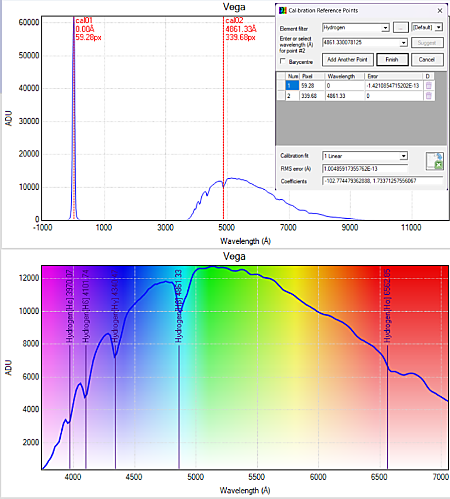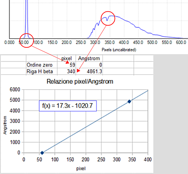 Per calibrazione in lambda del profilo spettrale si intende la trasformazione della coordinata pixel in Angstrom (lunghezze d’onda). Per farlo occorrerà trovare la relazione lineare che lega i pixel agli Angstrom. La stella (ordine 0) per definizione corrisponde a zero Angstrom. Occorre trovare a quale pixel corrisponderà la riga di assorbimento Hβ a 4861 Angstrom. E’ abbastanza facile individuarla poiché si trova nella parte centrale dello spettro, vicina al picco di sensibilità dei sensori ccd/cmos. Per esercizio si potrà trovare la trasformazione anche con un semplice foglio di calcolo (Fig. 14). La pendenza della retta di regressione che unisce i due punti ci fornirà il fattore di dispersione dello spettro, in questo caso 17.3  Å/pixel.