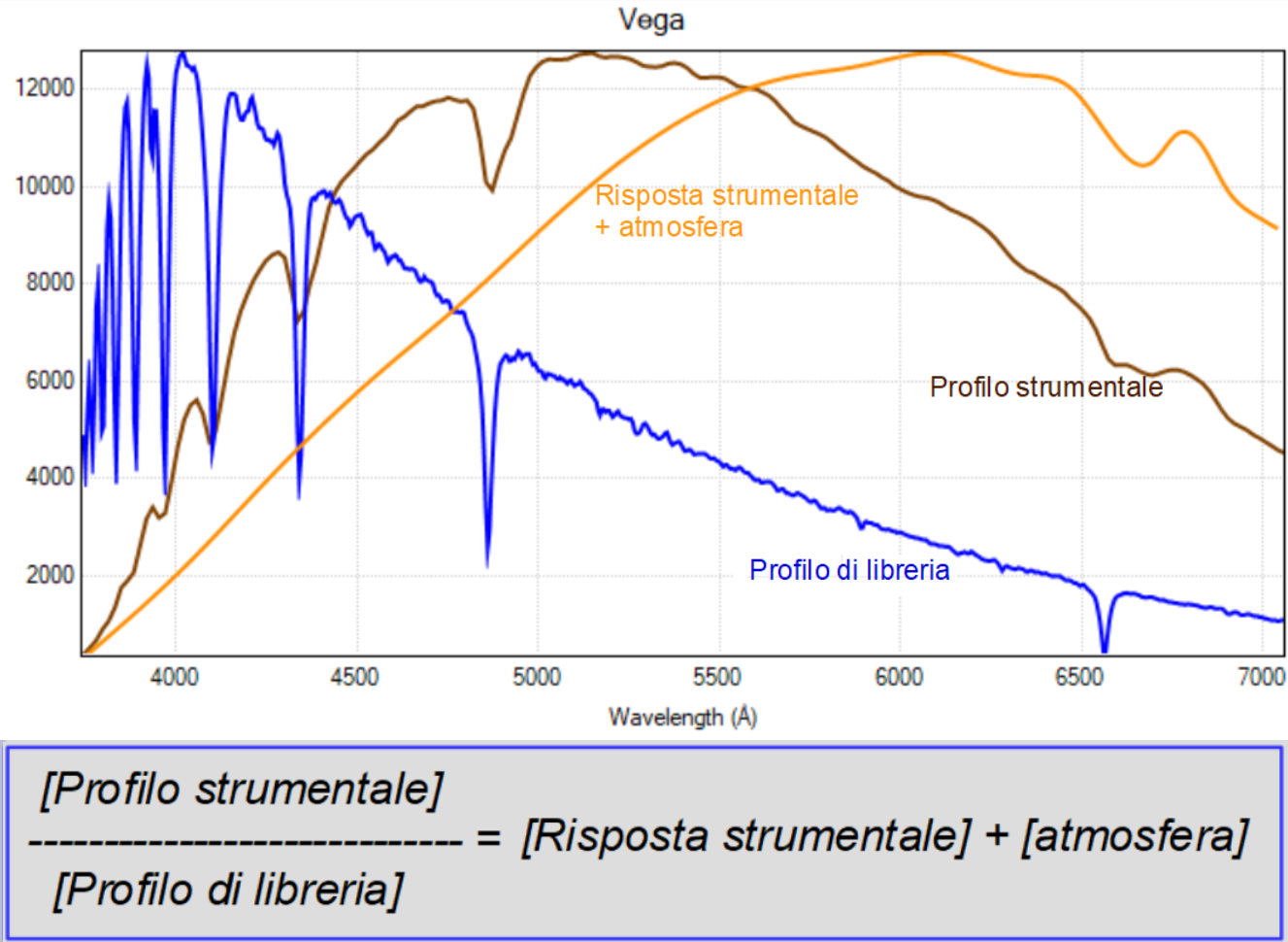 Il profilo calibrato in lambda della stella di riferimento (Vega) segue un andamento caratteristico, con le regioni del violetto e del rosso più attenuate dalla minore sensibilità del sensore ccd/cmos agli estremi della finestra della luce visibile (profilo marrone in Fig. 16). Si tratta pertanto di un profilo strumentale che non corrisponde al reale profilo spettrale della stella.