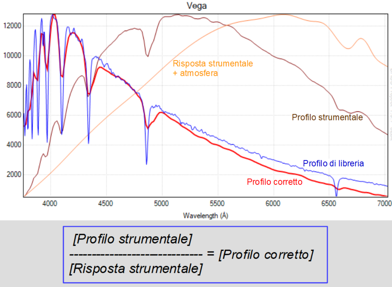 Possiamo correggere il profilo strumentale, ottenuto con le nostre osservazioni, per mezzo della curva di risposta strumentale, comprensiva degli effetti di assorbimento dell’atmosfera. Il profilo corretto si ottiene dividendo il profilo strumentale con quello della risposta strumentale.