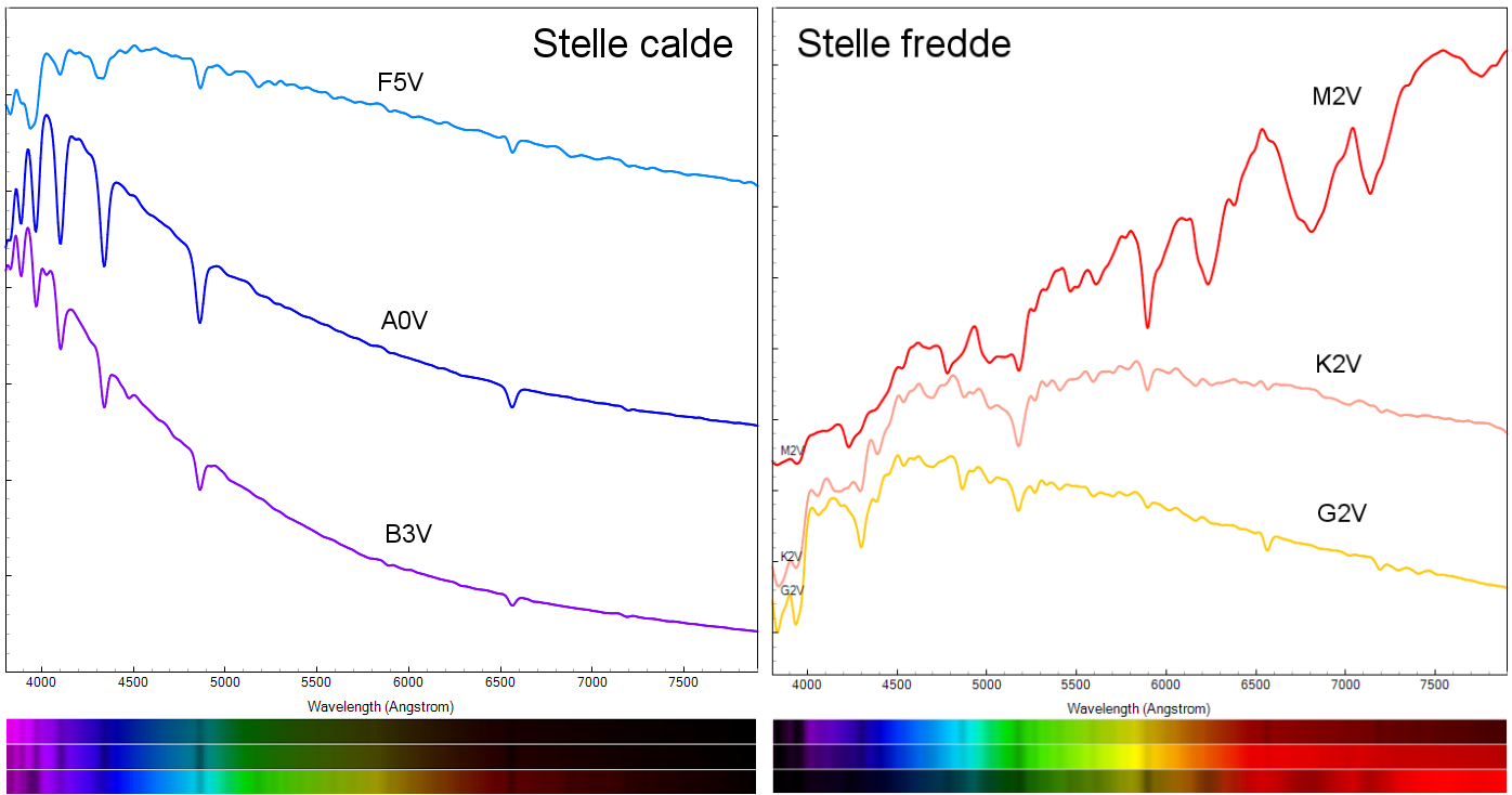 Figura 18: Spettri di stelle calde e fredde Sulle prime il continuo prevale nella regione violetto-blu con la presenza di righe di assorbimento dell’idrogeno. Sulle seconde il continuo prevale nella regione giallo-rossa e le righe di assorbimento dell’idrogeno non sono visibili.