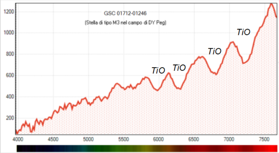 GSC 01712-01246 è una stella rossa di tipo M3 (ripresa nel campo della variabile DY Peg). Lo spettro in Fig. 20 mostra un continuo prevalente nel rosso solcato dalle caratteristiche bande di assorbimento molecolare TiO (ossido di titanio) che contraddistinguono questo tipo di stelle.