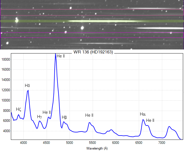 WR 136 è una stella peculiare di tipo Wolf-Rayet che si trova all’interno della Crescent Nebula. Le WR sono rare stelle massive, molto calde e con intensi venti stellari che le fanno perdere progressivamente il guscio di idrogeno. Nello spettro di Fig. 21 si possono notare le righe di emissione dell’idrogeno e dell’elio ionizzato molto allargate per effetto Doppler prodotto dalla velocità con cui si sta espandendo il guscio intorno alla stella.