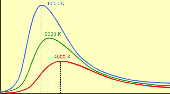 Figura 5: Andamento del flusso prodotto da una sorgente calda (curva di Planck) a diverse temperature. Il picco di intensità si sposta da sinistra verso destra al decrescere della temperatura della sorgente.