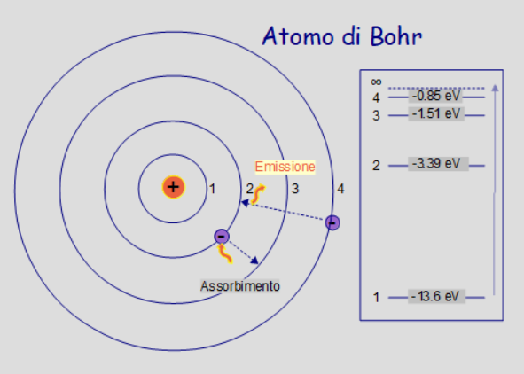 Figura 8: Il modello dell’atomo di idrogeno di Bohr è caratterizzato da livelli energetici discreti (quantizzati). Il salto degli elettroni tra i livelli energetici determina l’assorbimento o l’emissione di fotoni di una ben determinata lunghezza d’onda (colore).