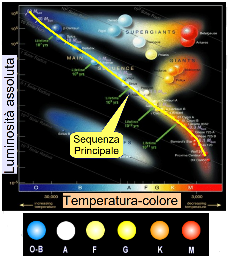 Figura 9: Il diagramma di Hertzsprung-Russell mette in relazione il colore delle stelle con la loro luminosità intrinseca. Le stelle trascorrono la maggior parte della loro vita sulla sequenza principale in condizioni di stabilità.