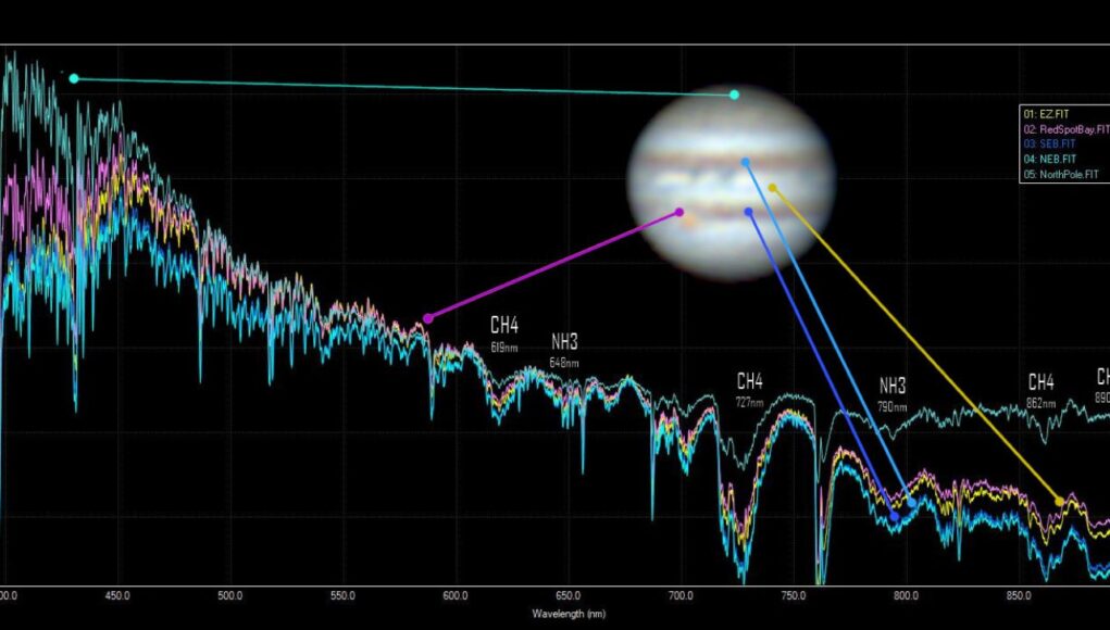 Ma torniamo al tema centrale, recentemente ho intrapreso quello che definisco un progetto di osservazione “estesa” su Giove e sui satelliti medicei, con l’obiettivo di studiare le differenze spettrali alle diverse latitudini del pianeta coinvolgendo anche i principali corpi che lo accompagnano: Io, Europa, Ganimede e Callisto.