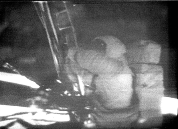 La soluzione che venne pensata, e poi applicata, potrebbe sembrare sempliciotta e quasi casalinga, ma funzionò alla perfezione. Si trattò di utilizzare una telecamera televisiva standard per riprendere direttamente uno schermo speciale, di un dispositivo appositamente pensato per riprodurre le immagini ricevute dall’Apollo 11! Una doppia ripresa quindi… ma la cosa funzionò alla perfezione, anche se le differenti frequenze e framerate impiegati richiesero una speciale telecamera ad alta velocità, normalmente usata nelle riprese di eventi sportivi (e a quanto pare le immagini arrivarono “a testa in giù” per come la telecamera era stata agganciata al modulo lunare, come si può vedere nell’immagine in alto, quindi andavano anche “girate”).
