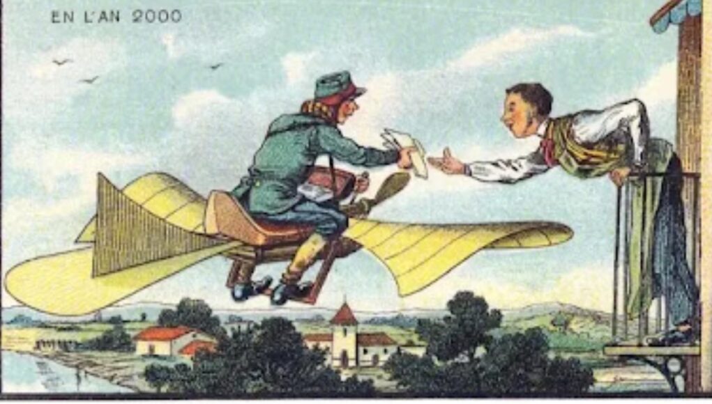 Tra il 1899 e il 1910, l’illustratore francese Villemard realizzò una serie di disegni in cui immaginava la tecnologia che avrebbe caratterizzato il mondo nell’anno 2000. Il futuro, che è poi il nostro presente, è immaginato da Villemard popolato da macchine volanti di vario tipo, tecnologie per muoversi nei cieli o esplorare i fondali marini, strumenti per automatizzare attività quotidiane come cucire vestiti, pulire il pavimento, cucinare o coltivare i campi.