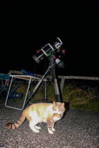 Un’altra occasione particolare si è presentata nello scorso luglio, quando un gatto semi selvatico mi è passato improvvisamente a tutta velocità sotto il treppiede del telescopio toccando i cavi di ripresa (ho dovuto rifare l’allineamento alla Polare perché si era leggermente spostata la montatura!). Ma la sorpresa quale è stata? Poco dopo me lo sono ritrovato vicino con un topolino di campagna in bocca a titolo di dono o trofeo. Purtroppo la vita del topolino è durata poco, ma questa è la natura…..