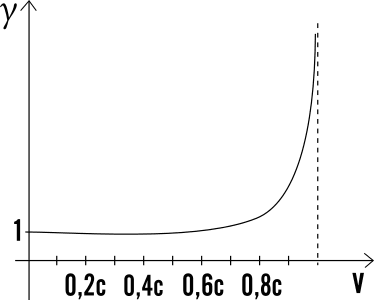 Come si può vedere dalla formula (e dal grafico qui sotto che la rappresenta visivamente), all’aumentare di ‘v’, approssimandosi a ‘c’ (quindi quando la velocità si avvicina a quella della luce), ‘γ’ (il Fattore di Lorentz) tende ad infinito.
