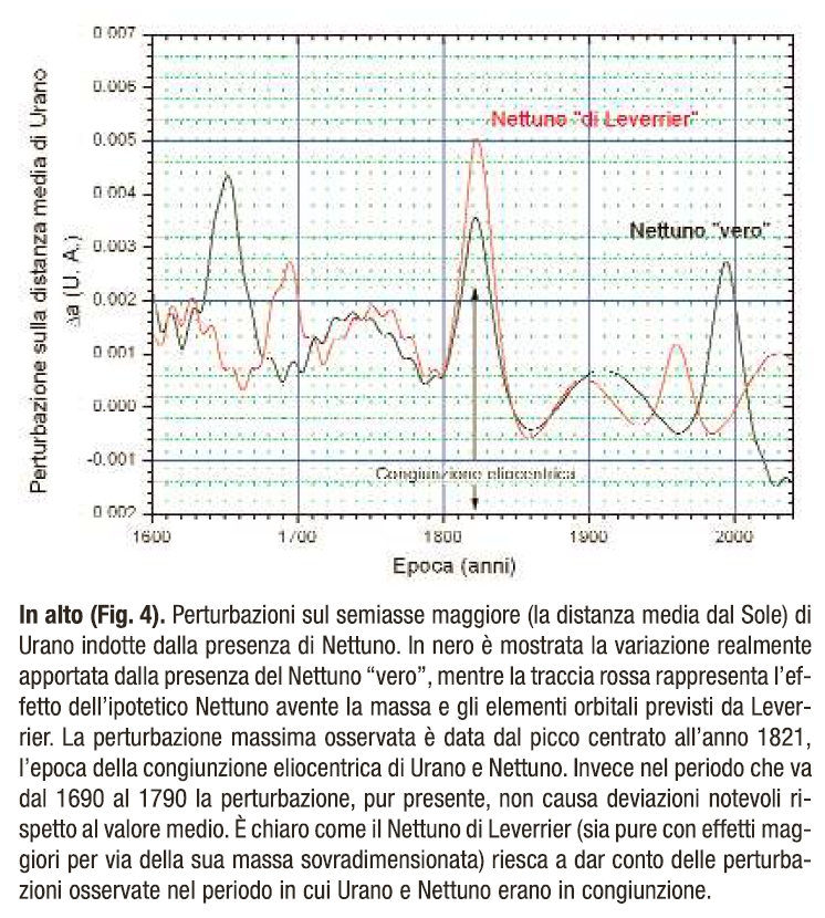 Queste curve sono nel complesso alquanto diverse, ma hanno in comune un andamento molto simile nell’intervallo che va dal 1710 al 1850, e quindi in quell’intervallo corrispondono a perturbazioni molto simili fra loro. In particolare per il “Nettuno di Le Verrier” il picco della massima perturbazione è centrato quasi perfettamente rispetto a quello del “Nettuno vero”. Questa “coincidenza di picchi” non è casuale, ma è una condizione necessaria perché un qualsiasi Nettuno diverso da quello “vero” possa produrre effetti simili sull’arco temporale menzionato e giustificare le irregolarità nel moto di Urano.