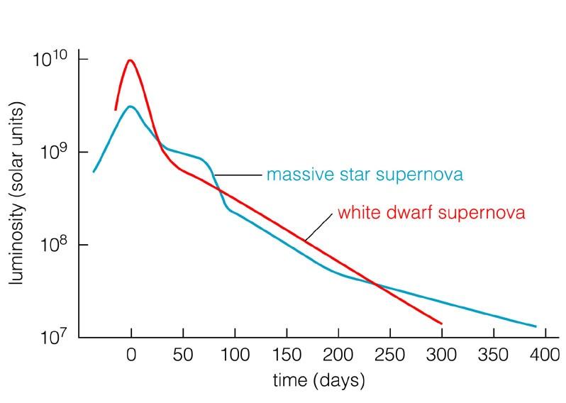 Le cose cambiano drasticamente per stelle dalla massa almeno 8 volte quella del Sole, alla cui vita, ricca di eventi, segue una morte ancor più spettacolare. Raggiunta in questo caso la fase di supergigante rossa, il loro nucleo diventa sufficientemente caldo da trasformare l’elio in una varietà di elementi via via sempre più pesanti. All’interno del nucleo, infatti, gli atomi di elio si combinano tra loro formando dapprima atomi di carbonio e ossigeno che, a loro volta, si fondono in elementi più pesanti come il silicio: la temperatura e la pressione nel nucleo di silicio sono sufficienti a convertire nuovamente tali atomi in ferro. La struttura della stella diviene simile a quella di una cipolla, con gusci concentrici di differente composizione a partire da quello più esterno, costituito principalmente da idrogeno, passando attraverso gli strati intermedi di elio, carbonio, ossigeno e silicio, per finire al nucleo di ferro. Come noto, le reazioni di fusione nucleare che hanno luogo nei nuclei stellari forniscono l’energia necessaria per sostenere il nucleo contro la forza di pressione dovuta al peso degli strati superiori.